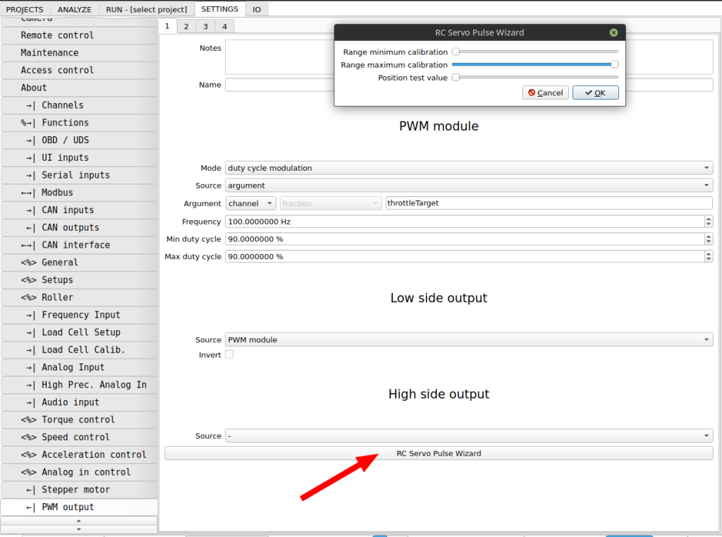 From SETTINGS / PWM output run RC Servo Pulse Wizard. It will set up the PWM module for correct frequency and duty cycle to execute servomotor movement in the range you require. It will also let you test servomotor position in real-time.